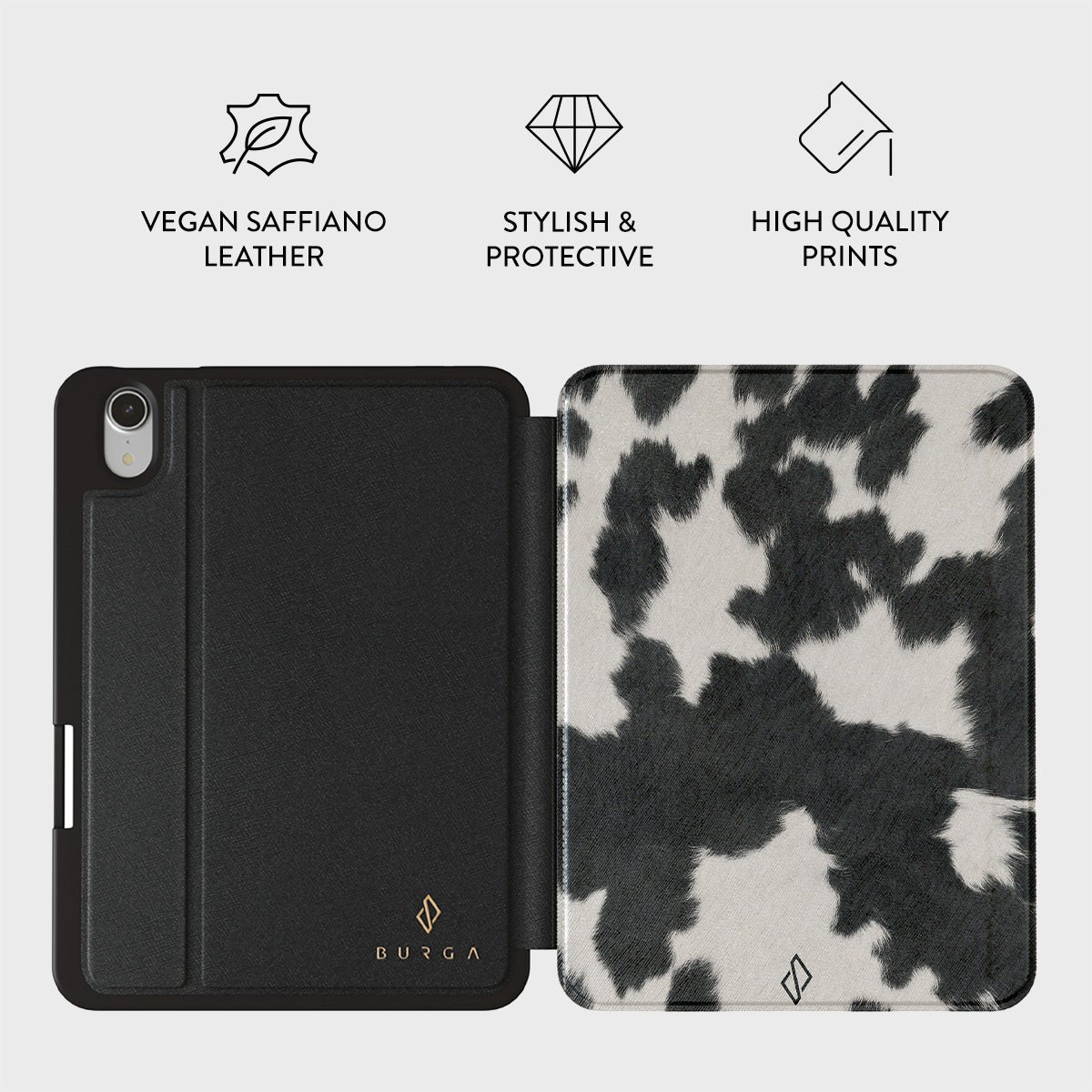 * The case is not textured-it is a printed pattern *Your iPad deserves to look cute and stay protected at all times. and our Achromatic iPad Mini 8.3 (A17 Pro/6th Gen) folio case will help you keep it safe and sound. The cow print in black and white is both daring and classic. making it the perfect addition to your accessory collection.